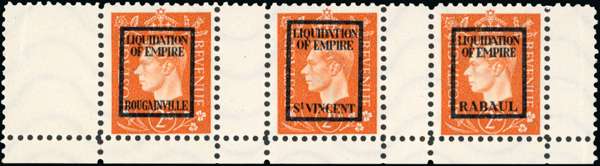 German Propaganda Forgeries. 2d marginal horizontal strip of three with LIQUIDATION OF EMPIRE overprints, BOUGAINVILLE, St VINCENT and RABAUL. Very scarce