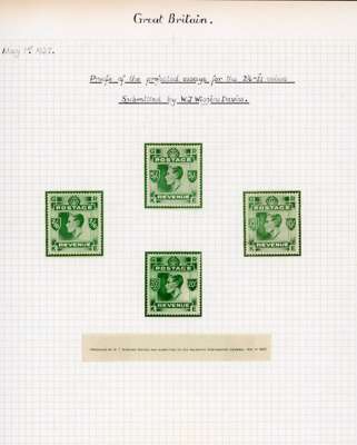 1937 W.T. Wiggins-Davies essays for the proposed high values, 2s.6d., 5s., 10s. and 20s with one complete set and inscription in green and a second set cut to size in all four colours (green, red, slate-blue & red-brown). (8)