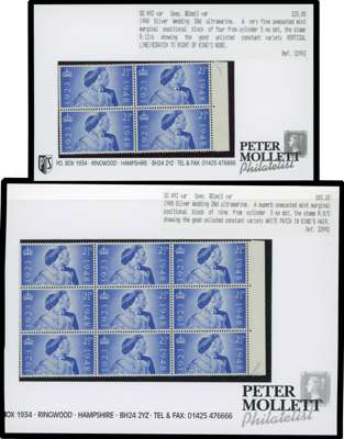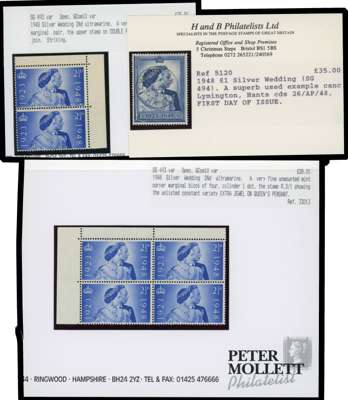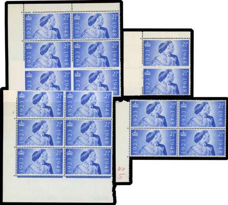 1937 Coronation and 1948 Royal Silver Wedding issues. A lovely selection of these two commemorative issues including multiple cylinder blocks, listed and unlisted varieties, paper join examples and a wonderful first day cds example of the £1 Silver Wedding issue. SG461, 493-4.