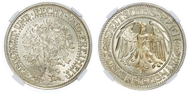 Germany. Weimar Republic AR 5 Marks, Oak Tree. 1929D.