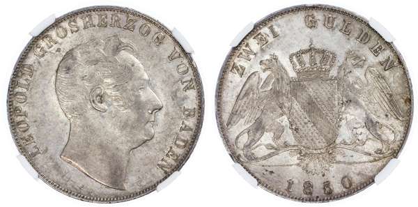 Germany States, Baden. Leopold I AR 2 Gulden. 1850. LEOPOLD GROSHERZOG VON BADEN, bust left / ZWEI GULDEN, date below Coat of arms. KM 222. 21.21g, 36mm, 12h.
