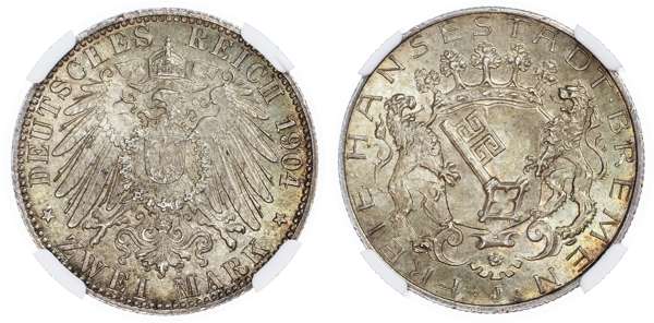 Germany, States, Bremen. Free City AR 2 Marks. 1904J.
