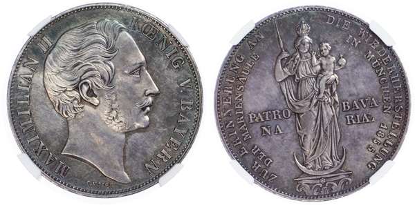 Germany, States, Bavaria. Maximilian II AR 2 Gulden. MAXIMILIAN II KŒNIG V. BAYERN, C.VOIGT below bust right / ZUR ERINNERUNG AN DIE WIEDERHERSTELLUNG, DER MARIENSÄULE IN MÜNCHEN date, PATRONA BAVARIÆ, in concentric circles, Standing Madonna centre. KM 848. 21.21g, 36mm, 12h.