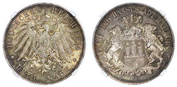 Germany, States. Hamburg AR 3 Marks. 1914J.