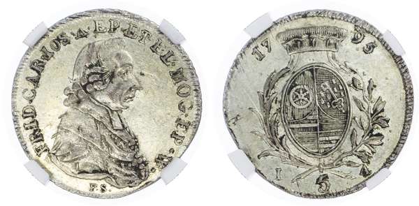 Germany, States, Mainz. Friedrich Carl Josef AR 5 Kreuzer. 1795 FS/1A. FIRD·CAR·IOS·A·EP·ET EL·MOG·EP·W·, F.S. below bust right / date divided by crown over Coat of Arms, 1 5 A below. KM 405. 12h.
