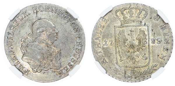Germany, States, Prussia. Frederick William II AR 1/3 Thaler. 1789E. FRIED. WILHELM KOENIG VON PREUSSEN, bust right / 3 EINEN R. THALER., E below Coat of Arms, date divided by shield. KM 344. 8.66g, 29.30mm, 11h.