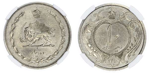 Iran. Reza Shah Ni 10 Dinars. SH1310 (1931). Crown over lion to left wielding sword with sun rays behind, wreath around, arabic script below / denomination and script in ornate border with crown above.. KM Y98. 3.8g, 21mm, 6h.