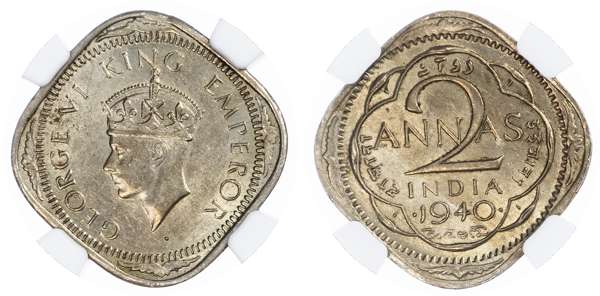 India, British Colonial. George VI Cu Ni 2 Annas. 1940(B). GEORGE VI KING EMPEROR, bust left on diamond planchet / دو آن दो आना দুই মানা, INDIA, denomination and date centre. KM 540. 5.84g, 25mm, 12h.