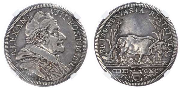 Italy, papal States. Pope Alexander VIII AR Teston. 1690 I. ALEXAN: VIII• PONT: MAI, bust right / RE•FRUMENTARIA•RESTITUTA•, CICIO, CXC. Small shield below two oxen in wheat field. PC: 2175. 10g, 33.50mm, 12h.