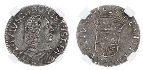 Italy, Papal States, Avignon. Flavio Chigi AR 1 Luigino. 1667. FLAVIVS·CAR·GHISIVS·LEG·AV, bust right / PAX·ORIETVR·EX·MONTIBVS★· date. Crowned Coat of Arms centre. KM 92. 1.90g, 6h.