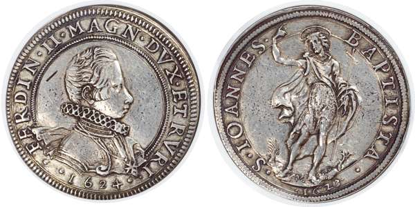 Italy, States, Tuscany. Ferdinand II de Medici AR Piastre. 1624/1623. FERDIN•II•MAGN•DUX•ET RURI• date below bust right / •S•IONNES• BAPTISTA • date below standing image of christ. DAV: 4199A. MIR 289. 30g, 6h.