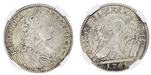 Italy, states. Venice AR 1/4 Tallero. 1780. RESPUBLICA VENETA divided by bust right / PAULO RAINERIO DUCE, date in exergue, seated haloed lion. KM 728. 7.14g, 29mm, 12h.
