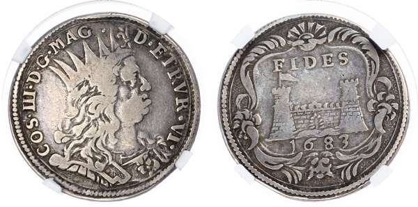 Italy,, States, Livorno. Cosimo III AR 1/4 Tallero. 1683. COS•III•D•G•MAG•D•ETRUR•VI• crowned bust right / FIDES, over castle with flags, date below, ornate border. KM 25. 6g, 6h.