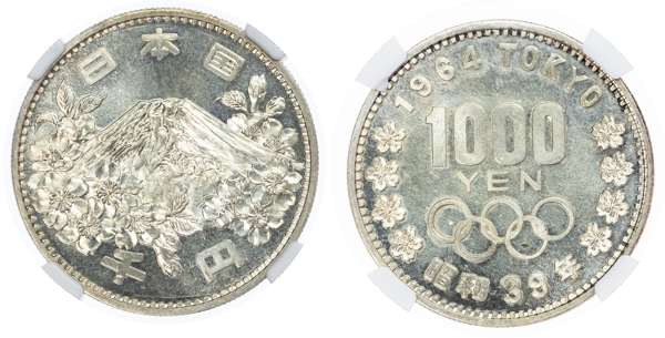 Japan. Tokyo Olympics AR 1000 Yen. 1964. 日本国. 千円 Mt. Fuji with cherry blossoms / date, TOKYO, denomination and Olympic rings centre, 昭和39年 below, rosettes to sides. KM Y80. 20g, 35mm, 12h.