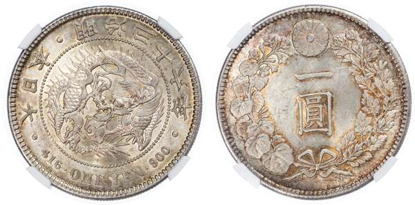 Japan. Meiji AR 1 Yen. M36 (1903). 年 四 十 二 治 明 · 本 日 大, · 416 · ONE YEN ·900 ·, Dragon within beaded circle / Chrysanthemum Flower (Coat of Arms & Emperor's Royal Seal)