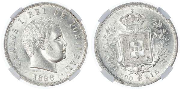 Portugal. Carlos I AR 500 Reis. 1896. CARLOS I REI DE PORTUGAL • date • ALVES below bust right / Crowned arms within wreath denomination below. KM 535. 12.50g, 30.59mm, 6h.