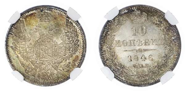 Russia, Empire. Nicholas I & Alexander II AR 10 Kopeks. 1846Cnb NA.