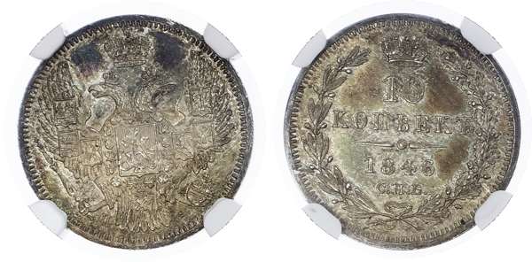 Russia, Empire. Nicholas I & Alexander II AR 10 Kopeks. 1846Cnb NA.
