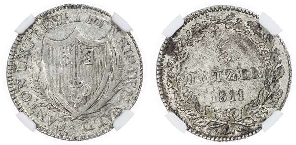 Switzerland, Cantonial. Unterwalden AR 5 Batzen. 1811. ✶ CANTON UNTERWALDEN NID DEM WALD, shield flanked by palm and laurel branches / denomination and date in wreath. KM A13. 4.40g, 27mm, 6h.