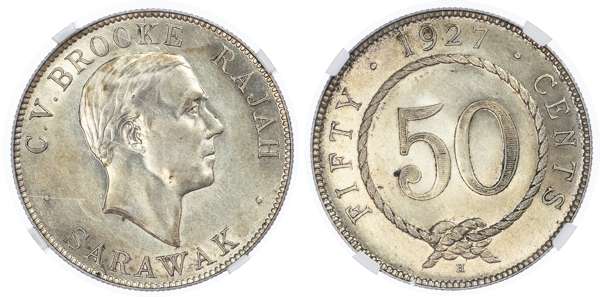 Sarawak, British Colonial. Charles V Brooke Rajah AR 50 Cents. 1927H. C. V. BROOKE RAJAH • SARAWAK • bust right / FIFTY • date • CENTS, denomination in tied rope border. KM 19. 10.30g, 31.30mm, 6h.