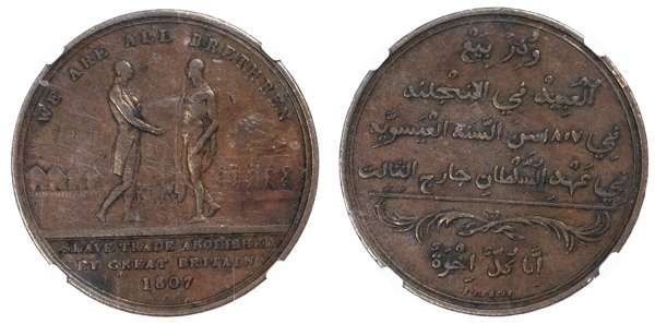 Sierra Leone, British Colonial. George III CU Penny Token. 1807 (1814). WE ARE ALL BRETHREN, SLAVE TRADE ABOLISHED, BY GREAT BRITAIN, date in exergue, British officer shaking hands with a freed slave / J.P. FECIT. Arabic inscriptions in several lines. KM Tn1. 16.84g, 36mm, 11h.