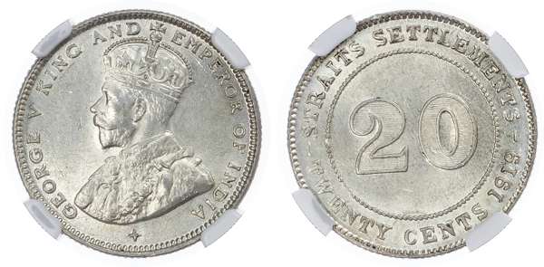 Straits Settlements, British Malaysia. George V AR 20 Cents. 1919B.