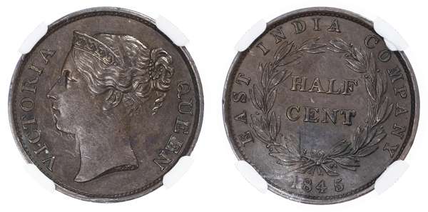 Straits Settlements, British Malaysia. Victoria CU 1/2 Cent. 1845 WW. VICTORIA QUEEN, W W on truncation, bust left / EAST INDIA COMPANY, date below, HALF CENT in wreath. KM 2. 4.66g, 22.50mm, 12h.