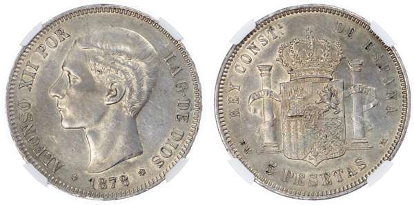 Spain. Alfonso XII AR 5 Pesetas. 1878(78). ALFONSO XII POR LA G·DE DIOS ❁ date ❁ bust left / REY CONSTL. DE E S P A Ñ A, PLUS ULTRA on banner, E·M· 5 PESETAS ·M·, crowned arms, pillars. KM 676. 25g, 37mm, 6h.