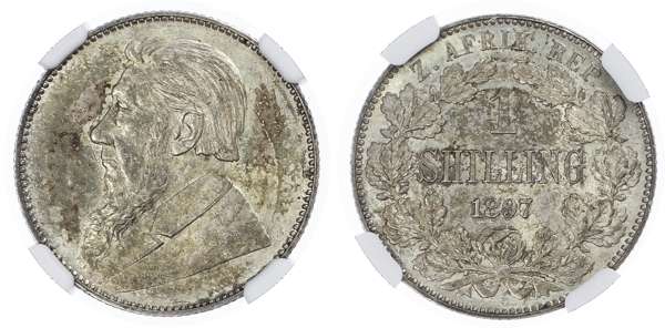 South Africa. Paul Kruger AR Shilling. 1897. Bearded bust of President Johannes Paulus Kruger left / Z. AFRIK. REP., wreath containing denomination and date. KM 5. 5.65g, 23.70mm, 11h.
