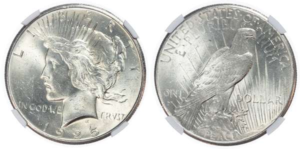 USA. AR Peace Dollar. 1925. LIBERTY, date below bust left, IN GOD WE TRUST divided by truncation, AF below / UNITED STATES OF AMERICA, E PLURIBUS UNUM, PEACE, ONE DOLLAR divided by standing eagle on rock with olive branch, sun rays rising. KM 150. 26.73g, ,38.10mm, 6h.