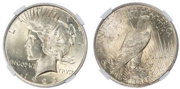 USA. AR Peace Dollar. 1923. LIBERTY, date below bust left, IN GOD WE TRUST divided by truncation, AF below / UNITED STATES OF AMERICA, E PLURIBUS UNUM, PEACE, ONE DOLLAR divided by standing eagle on rock with olive branch, sun rays rising. KM 150. 26.73g,38.10mm, 6h.