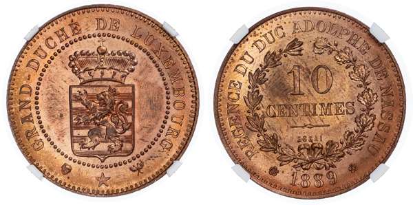 Luxembourg. Adolphus CU ESSAI 10 Centimes. 1889. Large Shield.