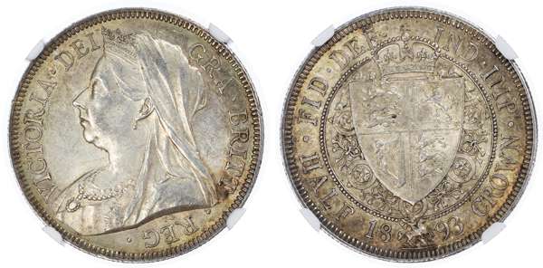 Great Britain. Victoria AR Halfcrown. 1893. VICTORIA·DEI GRA·BRITT · REG, T.B. below Veiled Old Head bust left / ·FID·DEF· IND·IMP· HALF CROWN divided by date below crowned Coat of Arms with ornate border. S: 3938. 14.14g, 32.30mm, 12h.