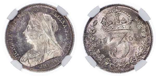 Great Britain. Victoria AR Threepence. 1900. VICTORIA·DEI·GRA · BRITT·REGINA·FID·DEF · IND·IMP·. T.B. below bust left / denomination divides date centre within wreath, crown above. S: 3942. 1.41g, 16mm, 12h.