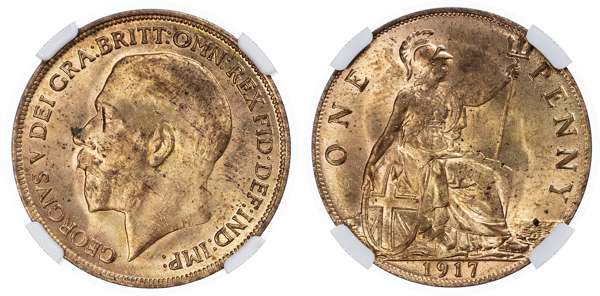 Great Britain. George V CU Penny. 1917. GEORGIVS V DEI GRA:BRITT:OMN:REX FID:DEF:IND:IMP:, B.M. below bust left / ONE PENNY divided by seated britannia, date in exergue. S: 4051. 9.45g, 30.80mm, 12h.