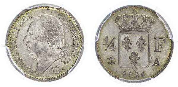 France. Louis XVIII AR 1/4 Franc. 1824A.