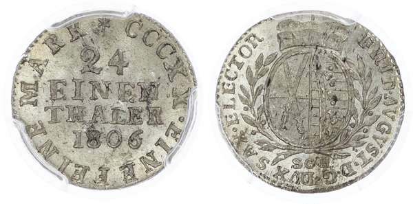 Germany, States. Saxony Bi 1/24 Thaler. 1806 SGH. CCCX X: EINE FEINE MARCK, 24 EINEN THALER, date below in centre / CCCX X: EINE FEINE MARCK around crowned Coat of Arms. KM 968. 1.98g, 20mm,, 12h.