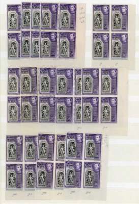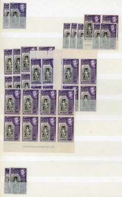 1947-9 2r black and violet mint multiples, the great majority unmounted. Thirteen Plate blocks, four unnumbered; one 2-2 and the balance 2a-2a, different printings very evident. Also 32 stamps in plain or imprint blocks. SG 396b