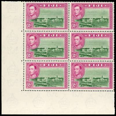 1942-6 2d green and magenta perf 13½ corner block of six, R10/2 scratched building. Fine unmounted o.g. SG 255aa, £75