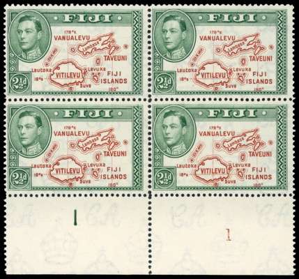 1942 2½d brown and green perf 14 block of four with both Plate numbers, R10/5 extra island and 9/6 Vatulele Curl, fine o.g., lightly hinged on the selvedge only. SG 256a, £200