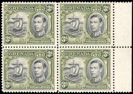 1950 3d black and brown-olive , perf 12½. Right marginal block of four with R5/6 colon flaw, light hingemark on selvedge with the stamps unmounted o.g. SG 158ba, £200