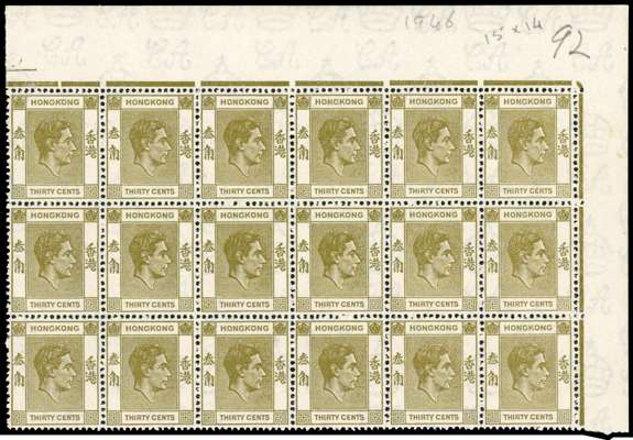 1945 30c yellowish olive perf 15 x 14 corner block of eighteen, fine unmounted o.g. SG 151a, £540