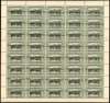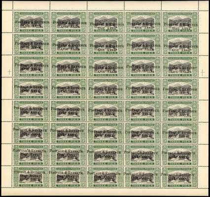 1950 1a on 3p black and green complete sheet of forty with lightly toned gum, unmounted o.g. R6/1 shows a partial omission of the ‘O’, R8/1 ‘P’ completely omitted and the footnoted varieties are present. SG 61, a, £2060+