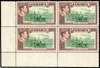 1938-52 1/- green and purple-brown lower left corner block of four, R11/1 repaired chimney, unmounted o.g., from a fairly early printing. One faint foxed perf. SG 130a, £650