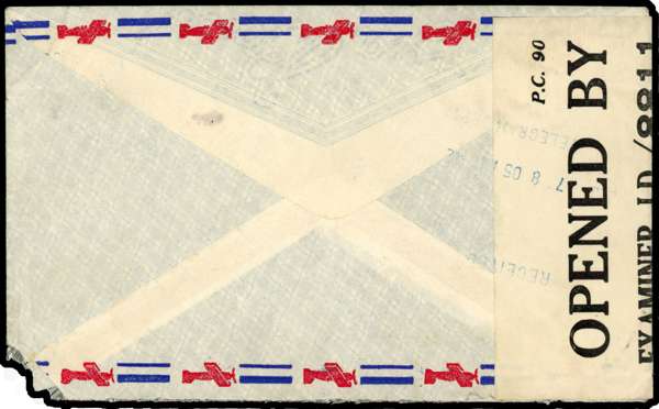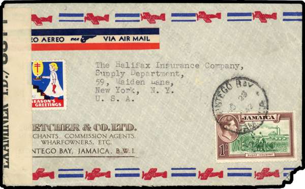 1942 envelope to New York bearing 1/- with R11/1 repaired chimney, Montego Bay CDS of NO 28, a couple of short perfs, of little consequence. Xmas label at left, partly covered by censor label. Envelope with lower right corner missing.. Ex Swarbrick. SG 30a