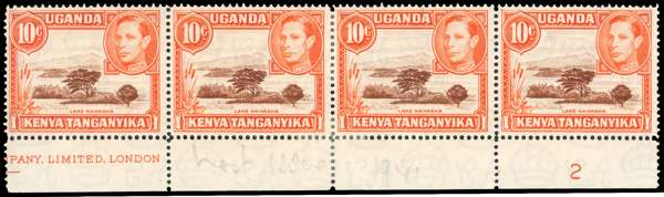 1941 10c perf 14 lower marginal strip of four with part imprint and FP2, o.g., rather awkwardly centrally reinforced. SG 134c, £520