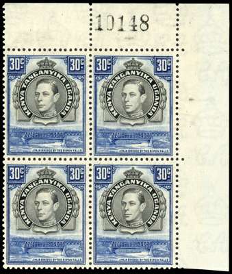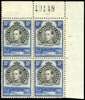 1939 30c perf 13¼ top right corner block of four with sheet number, unmounted o.g., very fine gum for this. SG 141, £240