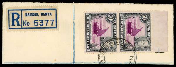 1938 50c vertical positional pair used on registered piece with Nairobi CDS (date unclear), R5/2 rope not joined to sail. SG 144a, £250