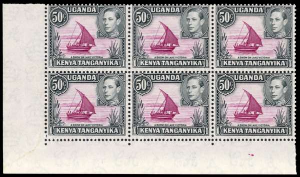 1950 50c perf 13 x 12½ corner block of six, showing dot removed on all save R9/1, unmounted o.g. SG 144ea, b, £725