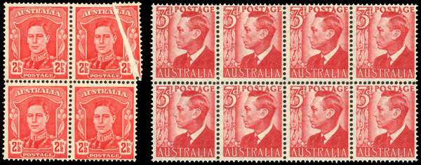 1951 3d scarlet unmounted o.g. block of eight on very thin paper, unmounted o.g. Fleck of foxing on reverse of one, otherwise very fine. SG 237d, ASC 251a, $800